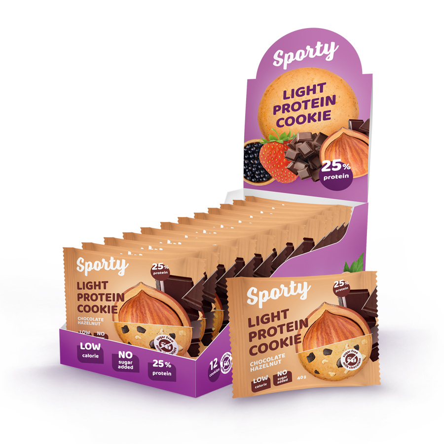 Sporty Protein Light «Шоколад-фундук» – лёгкое лакомство с 25% белка. Оно нежное, с кусочками настоящего шоколада и ароматного фундука, насыщенным вкусом и консистенцией мягкого бисквита – напоминает то самое из детства, только без сахара. Это любовь с первого укуса!