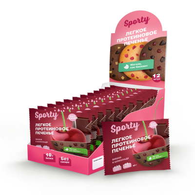 Sporty Protein Light «Вишня в шоколаде» – лёгкое лакомство с 25% белка. Оно нежное, с кусочками вишни, насыщенным вкусом и консистенцией мягкого бисквита. Если ПП-печенье, то Sporty!