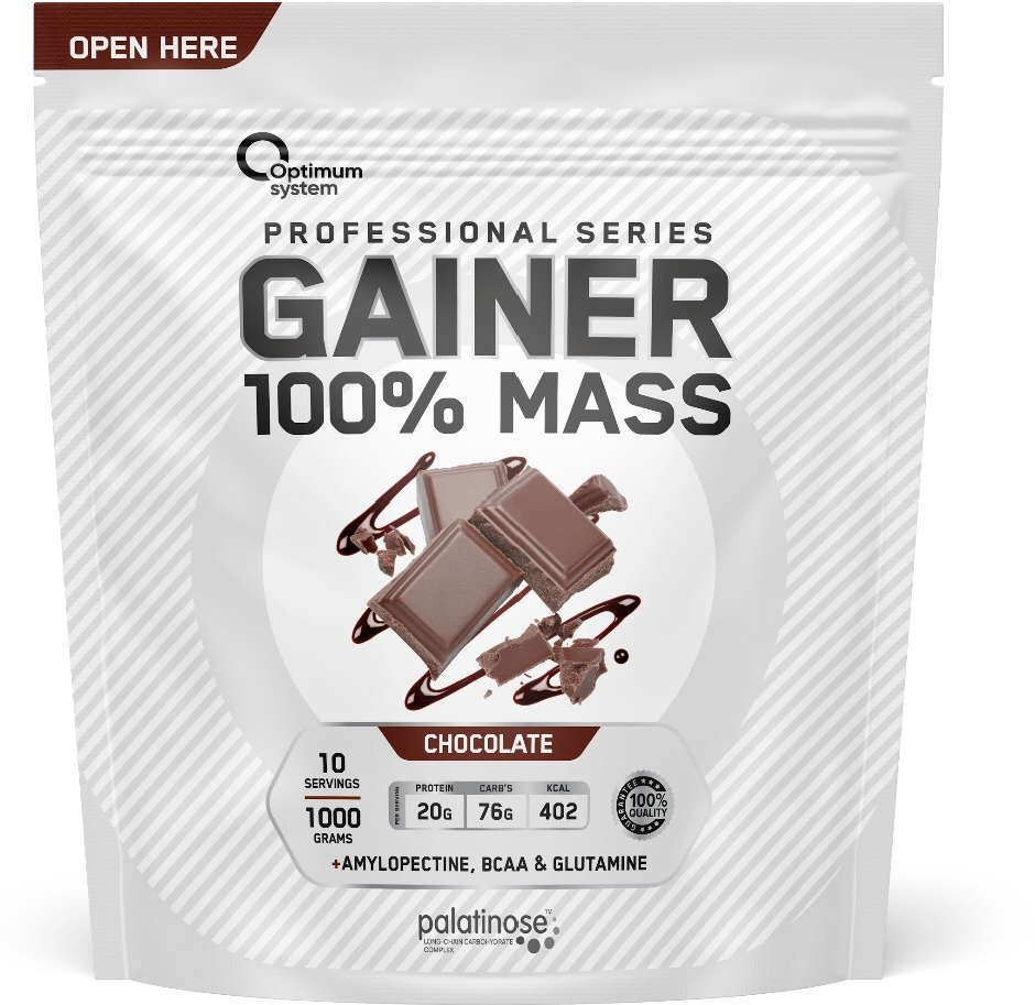 Гейнер – одна из самых массовых, эффективных добавок в индустрии спортивного питания. Гейнеры востребованы всегда, так как обеспечиваю рост мышечной массы и силы, что является основой для любых силовых видов спорта. Основная задача гейнера – обеспечивать организм быстроусвояемым белком и качественными углеводами. Особенность 100% Масс Гейнера от Оптимум Систем заключается в уникальной матрице из сложных углеводов, использовании высококачественного сырья и натуральных ароматизаторов.