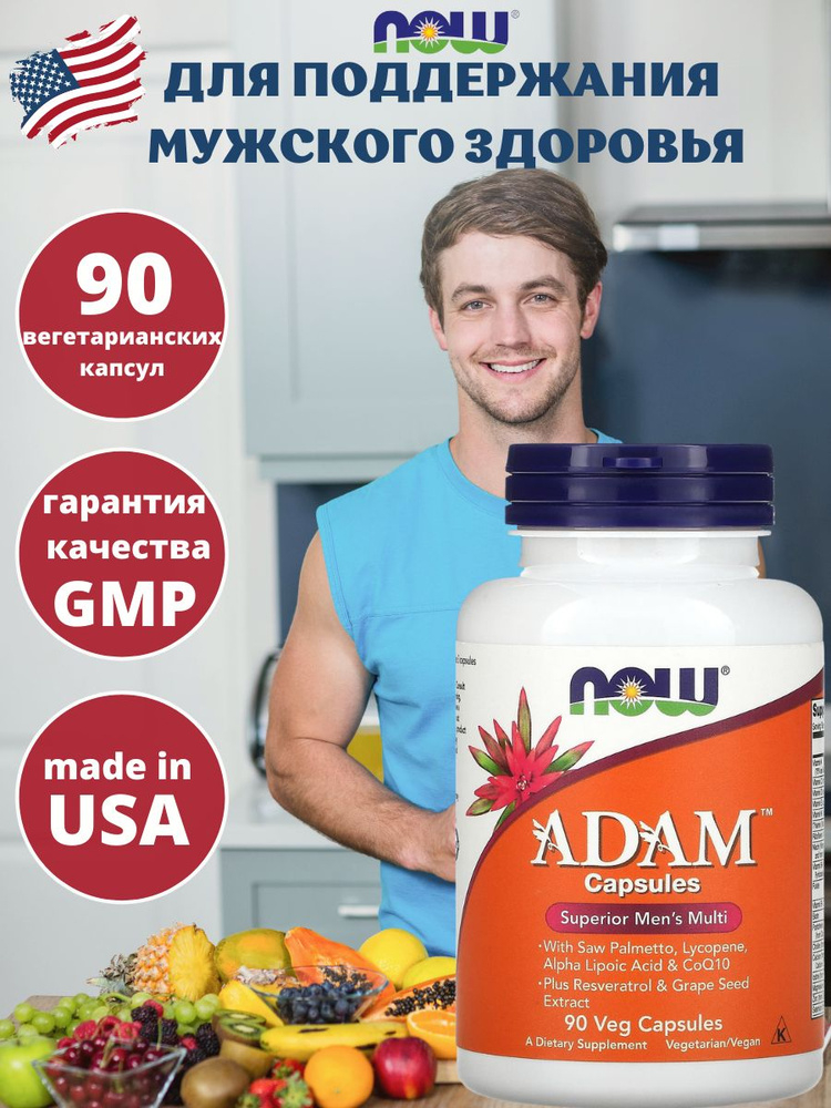 NOW ADAM - улучшенная формула мультивитаминов, обогащенная растительными экстрактами обеспечивающая организм всеми необходимыми микроэлементами для поддержания мужского здоровья. NOW ADAM - это: 13 витаминов и 10 минералов: пальмето, ликопин, альфа-липоевая кислота и коэнзим Q10 природный Плюс Транс-ресвератрол и экстракт виноградных косточек. Витамины и минералы NOW ADAM - это необходимая суточная доза для мужчин для поддержания здоровой репродуктивной, иммунной и других систем организма. Пальмето - сохраняя полноценную репродуктивную функцию мужчин нормализует работу предстательной железы и поддерживает нормальную работу мочевыделительной системы. Ликопин как самое эффективное антиоксидантное вещество предотвращает окисление холестерина LDL, вызываемого свободными радикалами, тем самым снижая риск сердечных приступов.