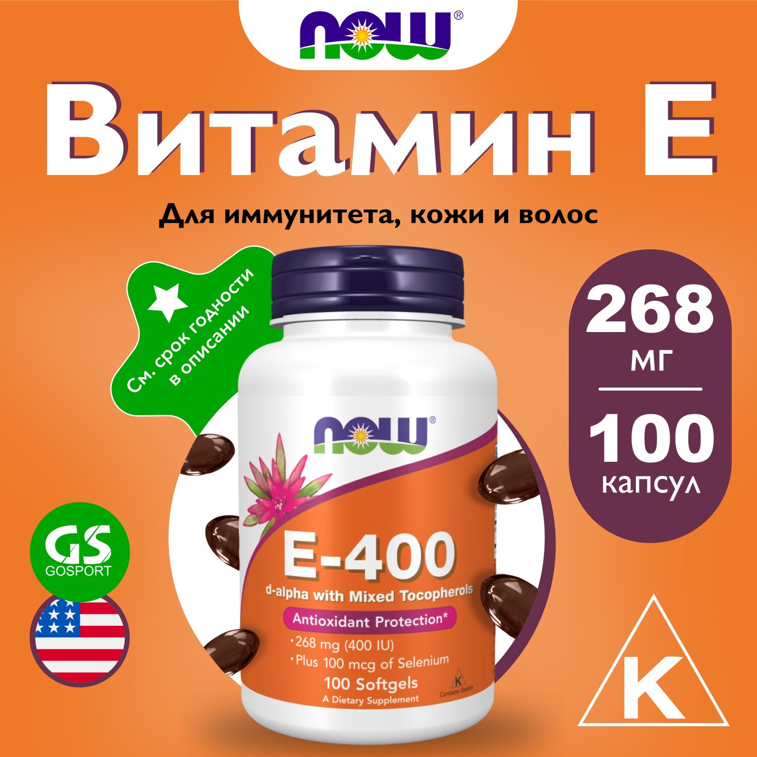 NOW Vitamin E-400 D-alpha with MT 100 гель.капсул