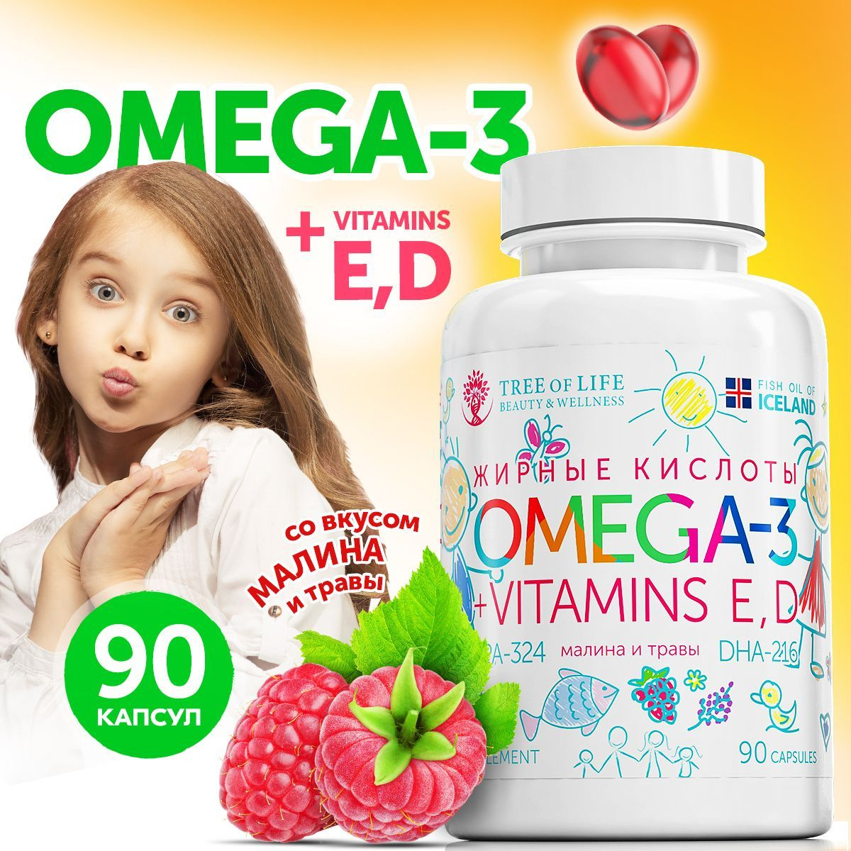 Витаминный комплекс Омега 3 + Витамины E, D для детей от"Tree of life", детский рыбий жир в капсулах. Биологически активная пищевая добавка для ребенка, изготовлена из исландского сырья морских глубоководных рыб.